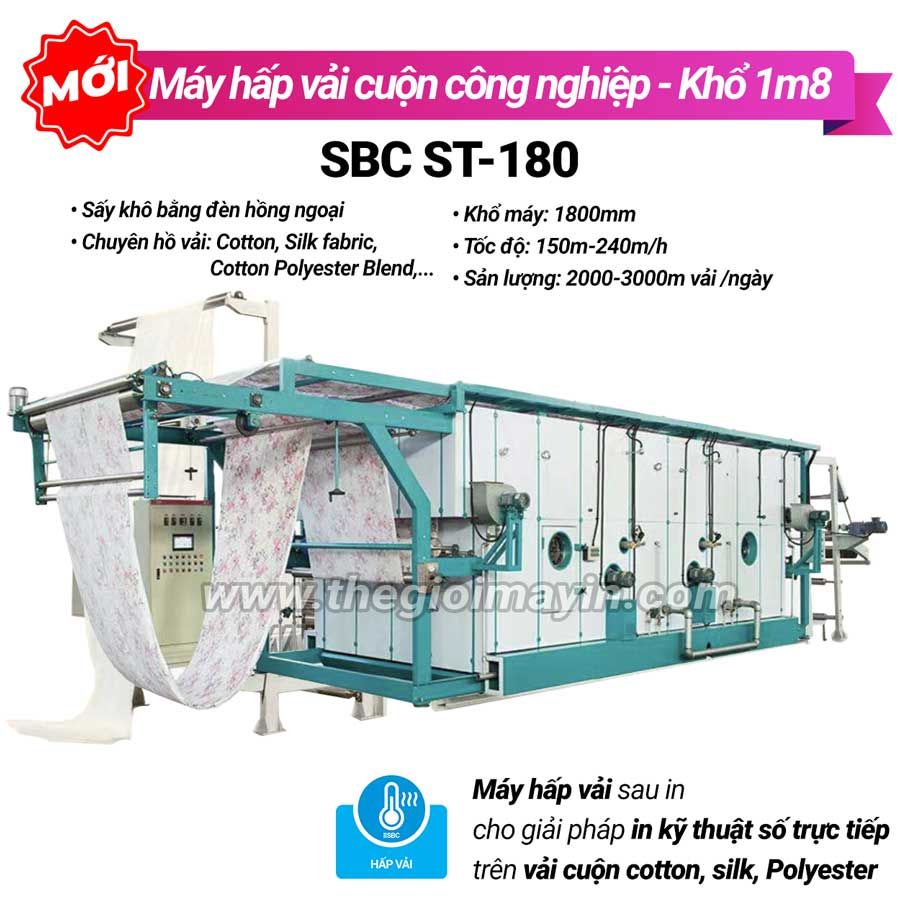 Máy hấp vải SBC ST-180 nằm ở bước thứ 3 trong Quy trình in vải cuộn kỹ thuật số 5 bước. Máy hấp vải cuộn khổ 1m8 chuyên hấp vải cuộn cotton, vải cuộn Polyester, vải lụa silk cuộn, Cotton polyester blend,…