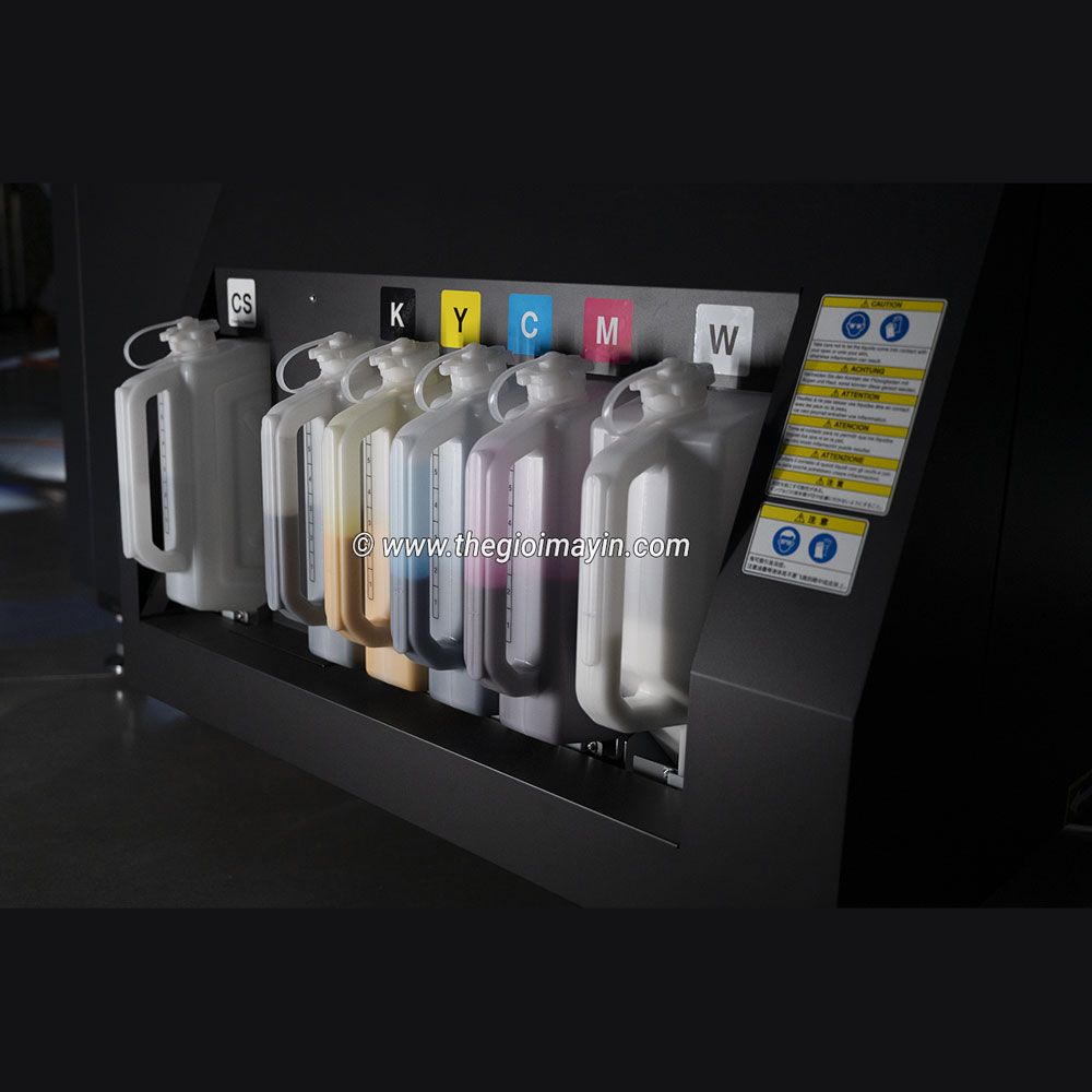 | Tối đa 1200dpi x 1200dpi | Đơn hoặc đôi cho CMYK. Underbase và highlight cho màu trắng. |