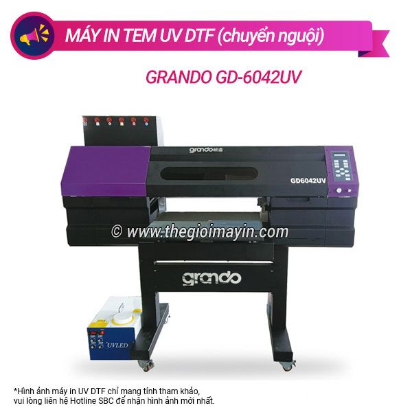 1. Máy in tem UV DTF GRANDO GD-6042UV sử dụng đầu phun Epson – I1600 của Nhật, diện tích hạt mực lên đến 3.5PL, tốc độ nhanh có độ phân giải cao giúp nâng cao chất lượng bản in